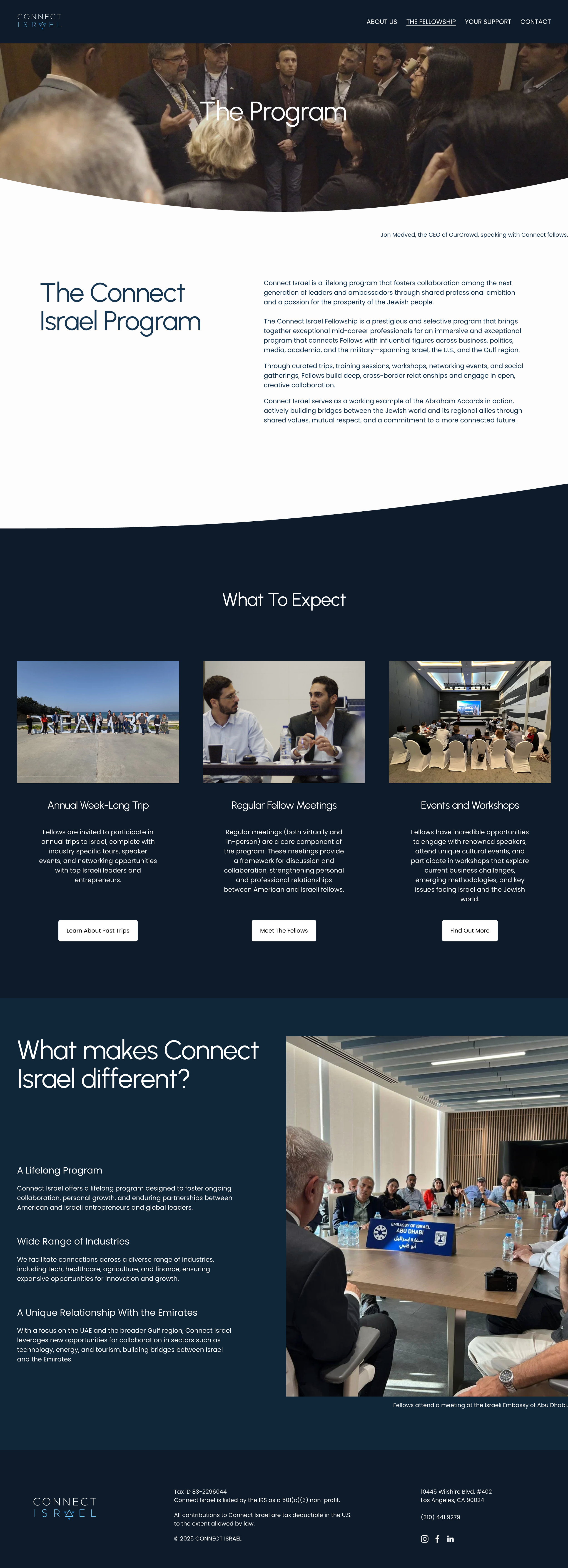 I was hired to redesign the Connect Israel website with two primary user groups in mind: prospective fellows interested in applying to the program, and donors looking to support the organization. The new design prioritizes clarity, storytelling, and accessibility—showcasing the organization’s mission, past programs, and future vision in a visually appealing, easy-to-navigate format. The refreshed site gives the organization a more polished and contemporary presence online.